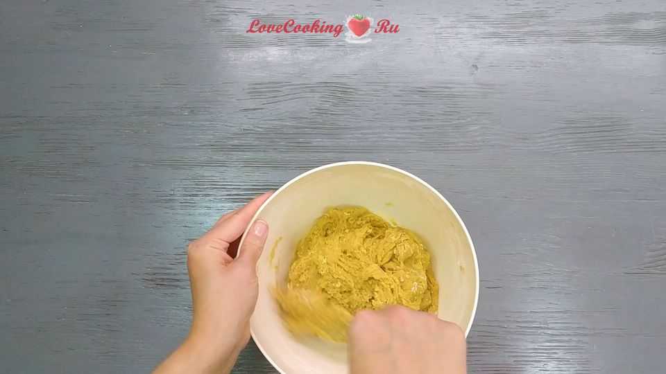 Засыпаем муку и замешиваем тесто. Мне удобно перемешивать вилкой. Тесто будет очень нежным.