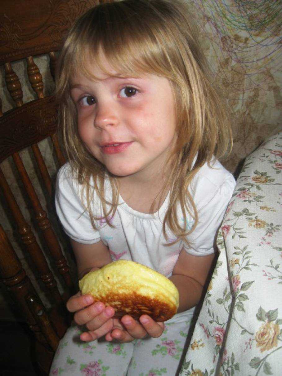 - Оладьи подавайте небольшими порциями, лишнего ребёнку давать не следует.