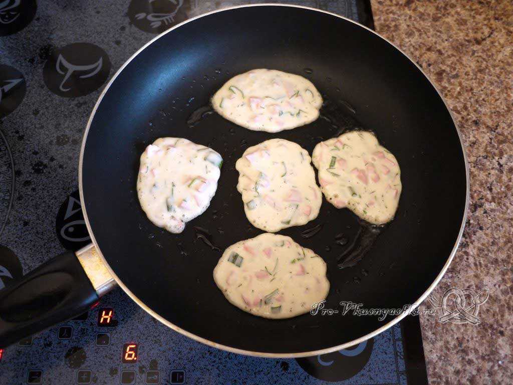 С помощью ложки или даже двух, сформируйте на сковородке небольшие оладьи. Они должны быть не крупнее ладони, обычно хватает объема теста помещающегося в столовой ложке.