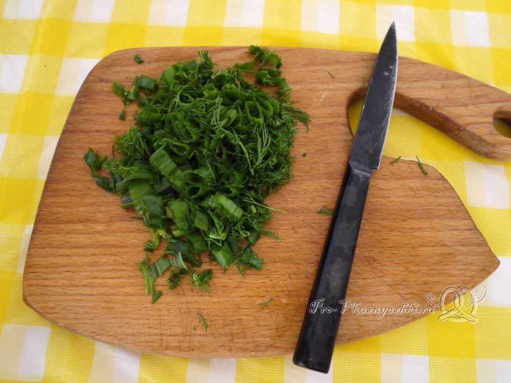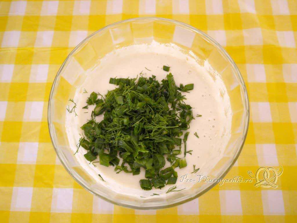 4. Тщательно вымойте и измельчите зелень. Добавьте ее в тесто и перемешайте.