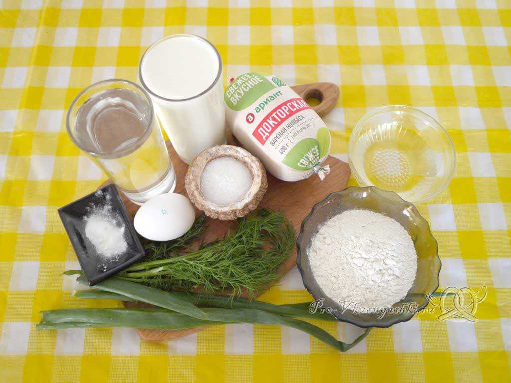 Подготовим ингредиенты. Зелень и яйцо моем под проточной водой. Пшеничную муку просеиваем, обогащая кислородом. С колбасы снимаем пленку.