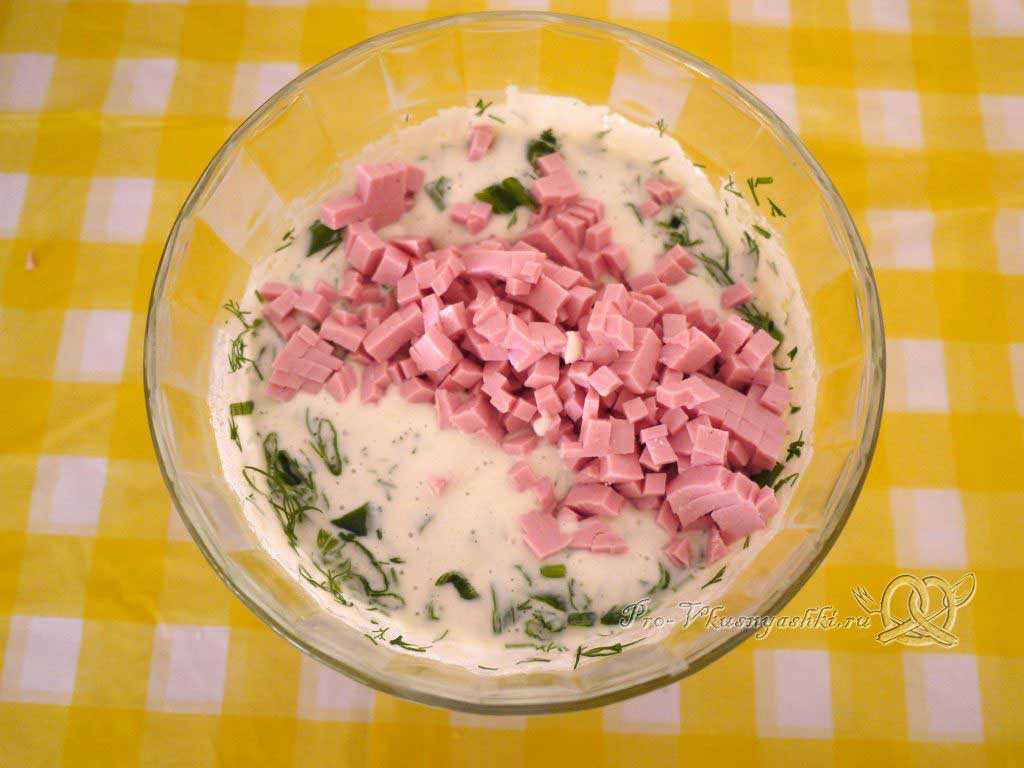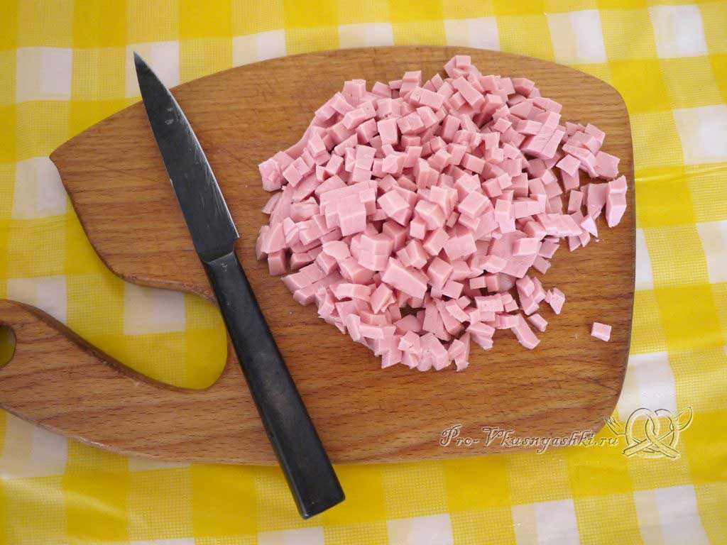 Колбасу нарезаем мелким кубиком, чем мельче, тем лучше.