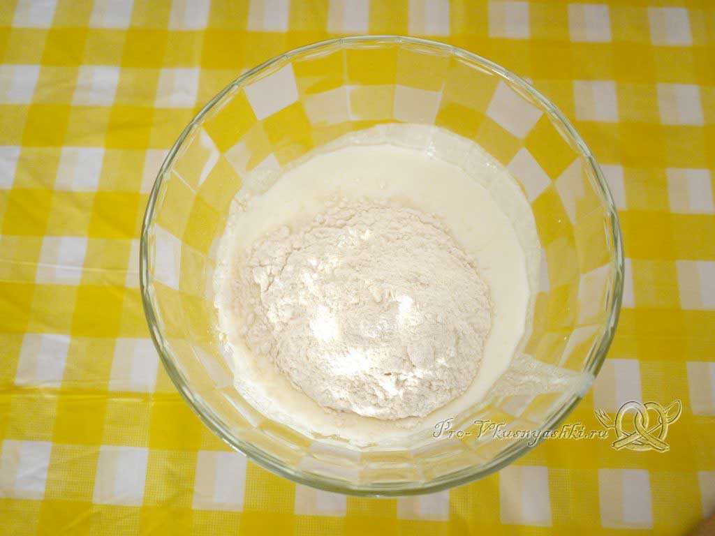 - Добавьте постепенно муку и разрыхлитель с содой, перемешайте до исчезновения комочков.