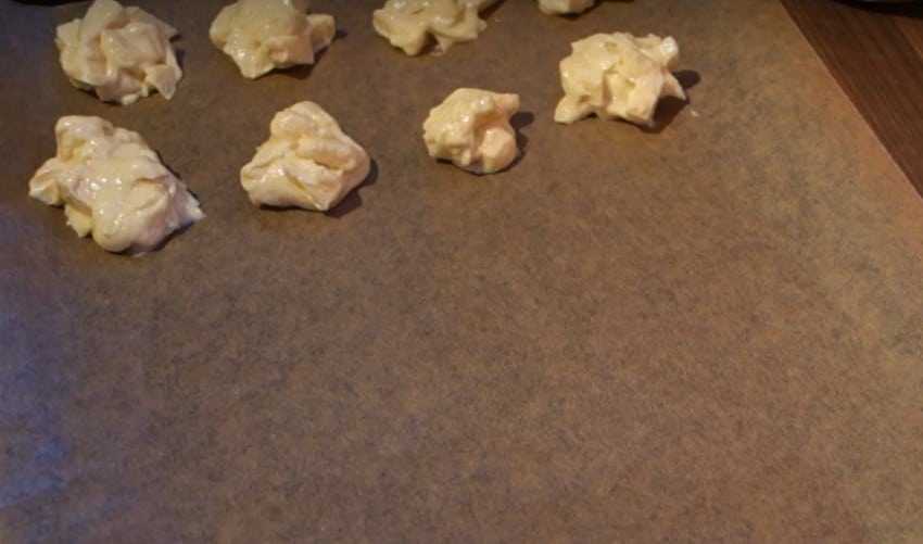 4. Противень застелите бумагой для выпечки, слегка смажьте маслом, с помощью ложки разложите тесто небольшими горками.