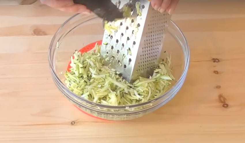 - Кабачок натираем на крупной терке и отжимаем жидкость. Добавляем кабачок к луку.