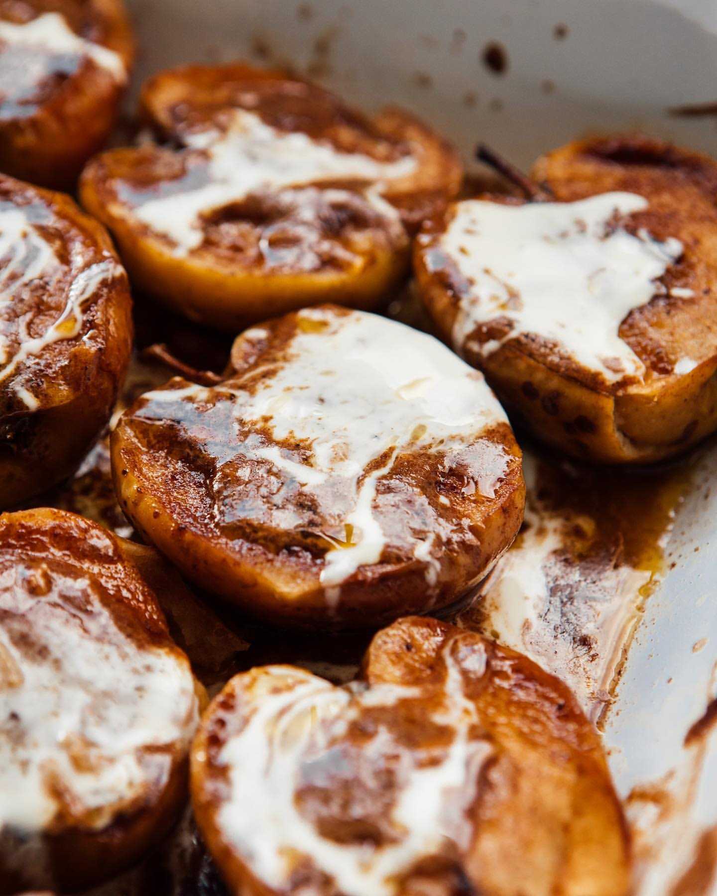 - Вынуть форму, полить плоды мёдом, затем посыпать корицей и имбирем.
