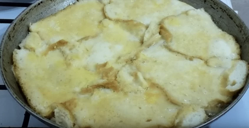 3. Разогреваем сковороду, смазываем ее растительным маслом и вкладываем на нее кусочки набухшего батона, стараясь, чтобы не осталось «дырок». Сверху поливаем слегка взбитым яйцом.
