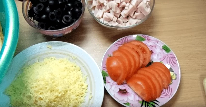 4. Тем временем подготовить компоненты для начинки. Ее можно сделать только с сыром и помидорами, как в предыдущем рецепте. А можно сделать ее посытнее и добавить любой колбасы, или ветчины, мяса или курятины. Особенно это порадует любителей-мясоедов.