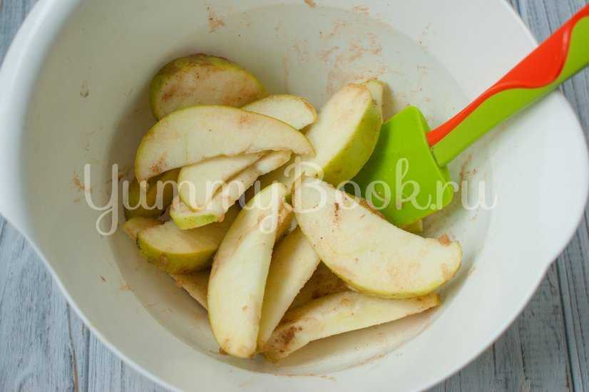 1. Яблоки помыть, удалить сердцевину и нарезать дольками. В миску сложить дольки яблок, добавить сахар, корицу и сок лимона. Перемешать.