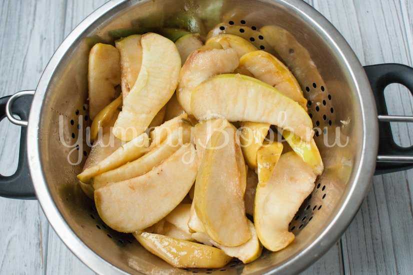 Сами яблоки необходимо очистить от кожуры и семечек, нарезать слайсами средней толщины и выложить в нашу форму с сиропом