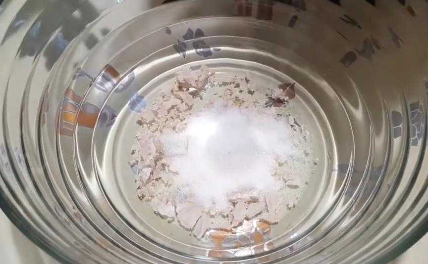 Смешать измельченные дрожжи с сахарным песком и солью.