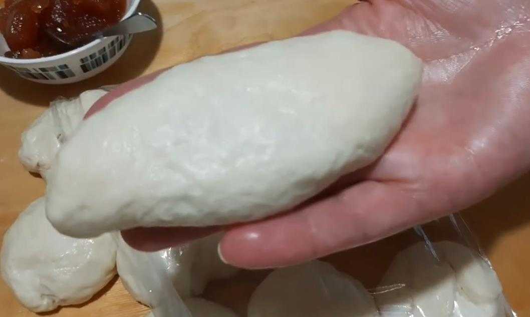 - Замесить на разделочной доске, смазанной маслом, эластичное тесто. Разделить на небольшие шарики, приплюснуть их и начинить небольшим количеством повидла.