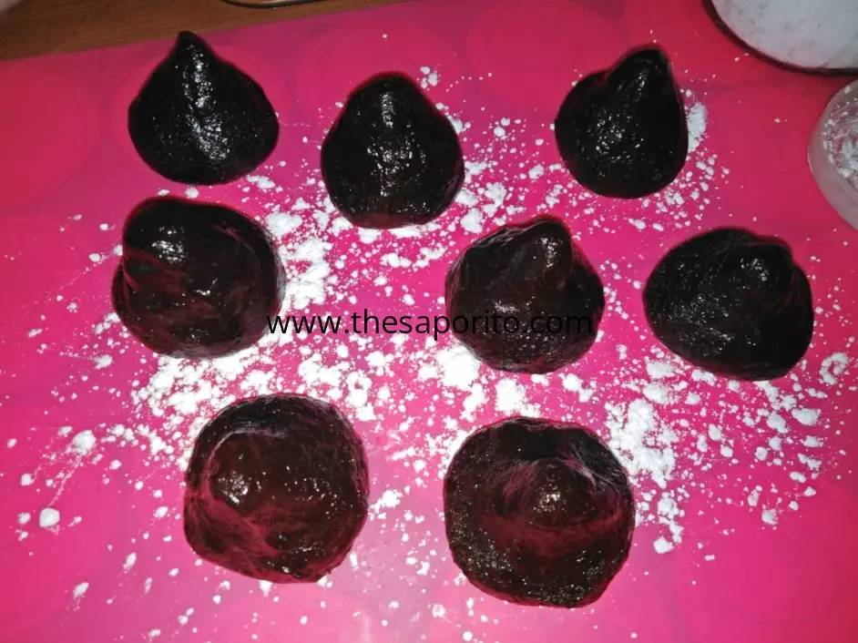 Каждую часть скатываем шариком. Укладываем на блюдо и накрываем пищевой плёнкой. Убираем в морозильную камеру на 60 минут.