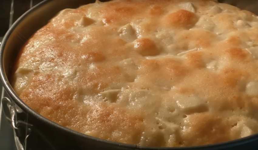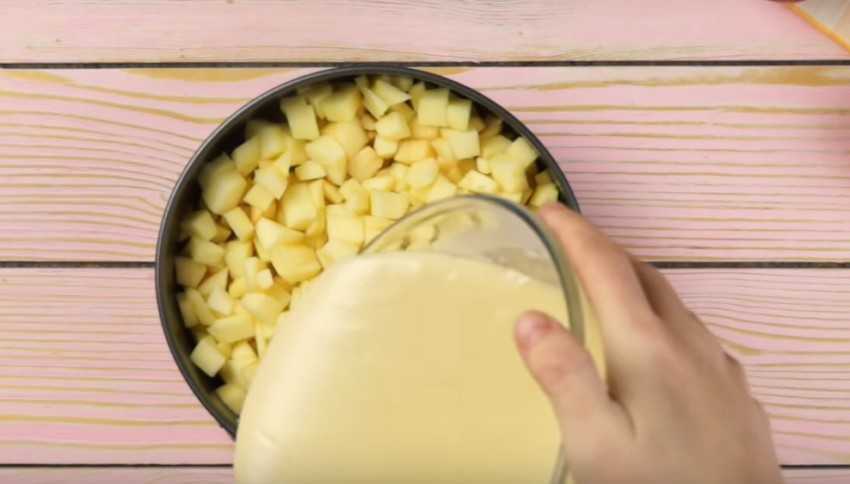 - Заливаем яблоки тестом и всю поверхность пирога слегка разравниваем. Ставим в разогретую духовку выпекаться.