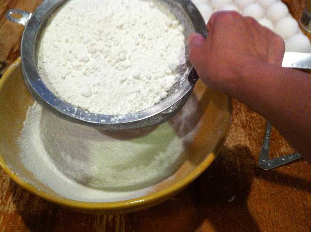 - Просеиваем муку в тесто и не спеша смешиваем.