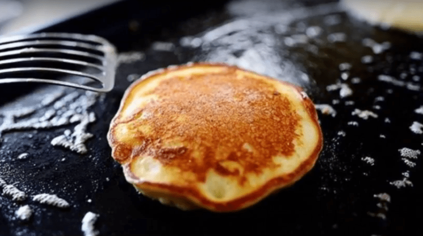- Обжаривать на среднем огне с обеих сторон, примерно по 2 мин. В процессе жарки не приминать оладьи, иначе они будут плоскими.