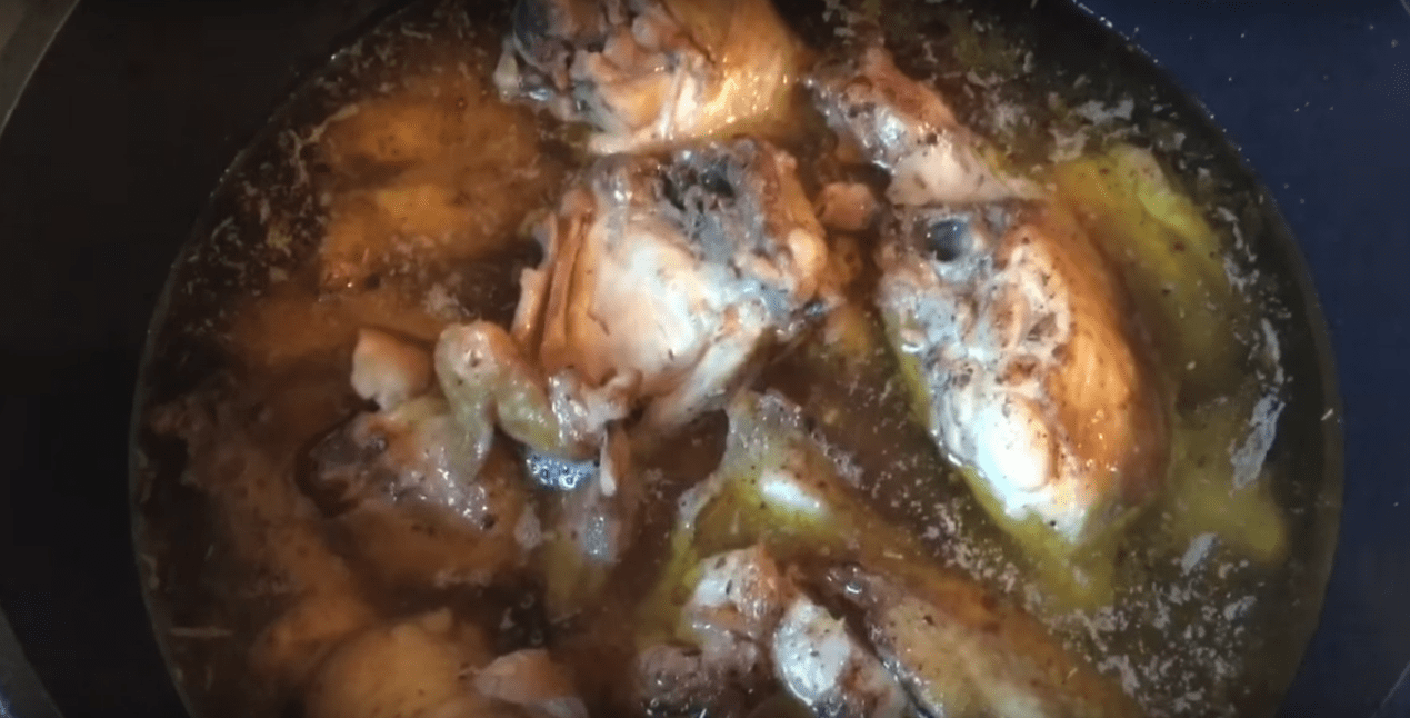 Курицу обжариваем на сковороде до золотистой корочки буквально 7-10 минут, а затем помещаем в кастрюлю и заливаем кипятком. Воды льем ровно столько, чтобы она только-только накрыла мясо. Ставим кастрюлю на средний огонь.