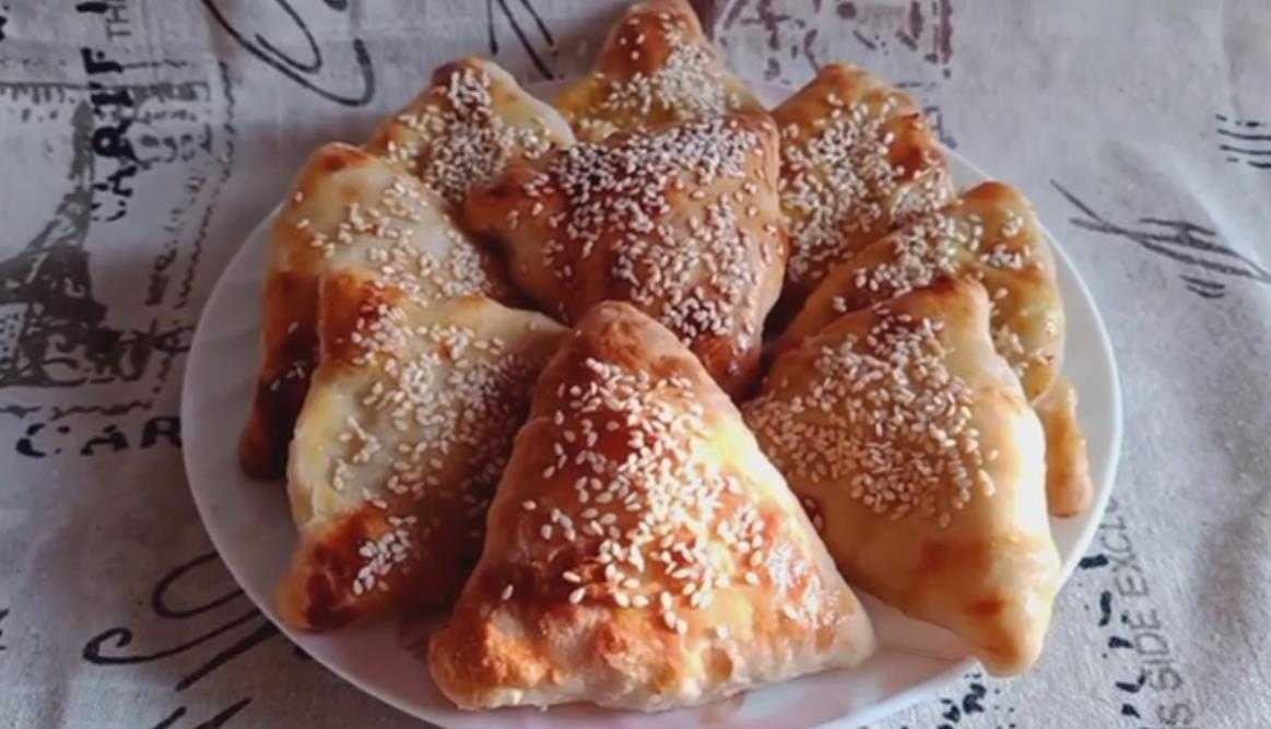 Нарезаем тесто на порционные кусочки. Каждый кусочек раскатываем лепешку. В центр лепешки выкладываем начинку и защипываем края. Выкладываем на смазанный противень швов вниз. Выпекаем при 200 градусах 20 минут, затем убавим нагрев до 150 градусов. На этом моменте извлечем противень из духовки и хорошо сбрызнем изделия и сам противень водой. Такая обработка сделаем тесто более мягким. Выпекаем до зарумянивания.