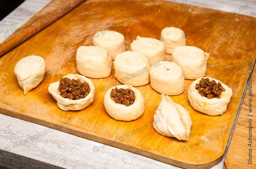 - Каждый кусок тонко раскатывается скалкой, внутрь укладывается начинка и миниатюрный ломтик сливочного масла.