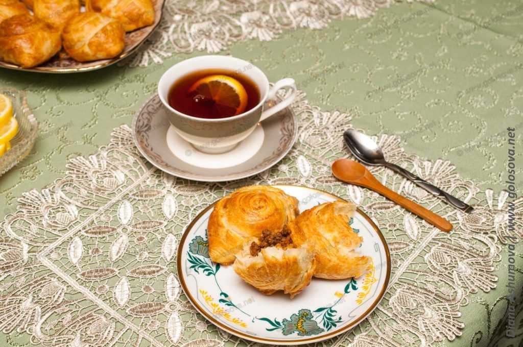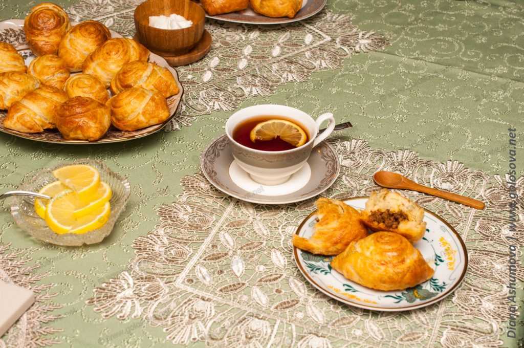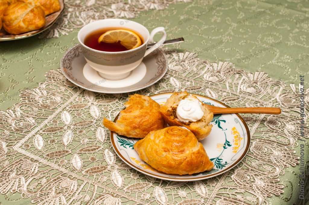 Дальше остается только заварить крепкий черный чай и сервировать стол. Мы подобную несладкую выпечку с мясом или грибами любим дополнять сметаной. А к чаю нужен лимон и сахарный песок по желанию.