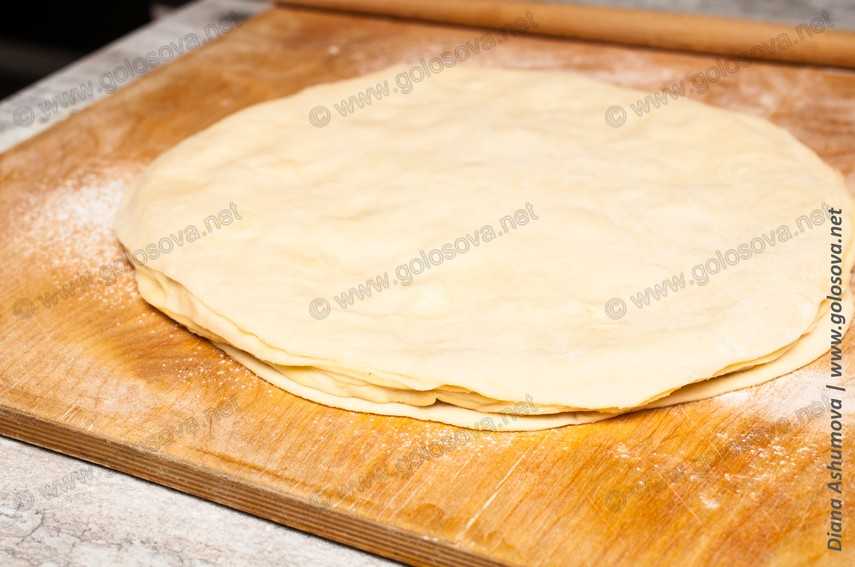 Раскатываю круг в 2 раза больше, стараюсь, чтобы все слои равномерно увеличивались в диаметре.