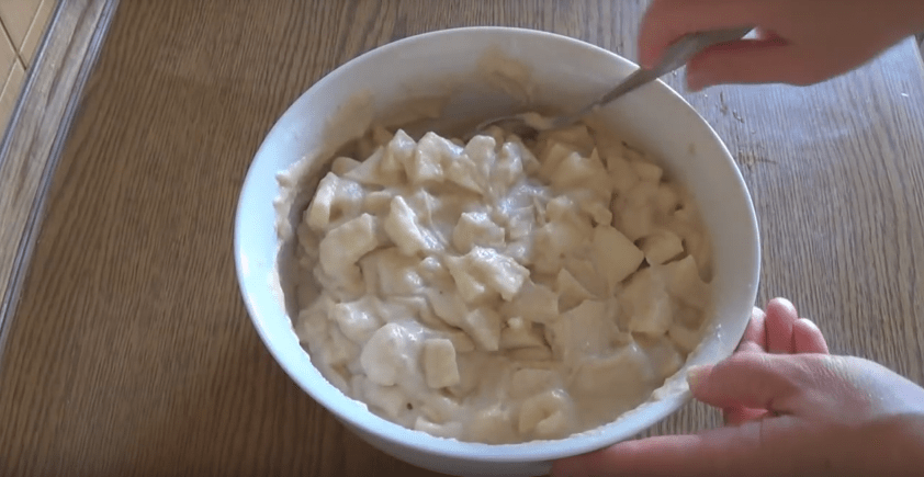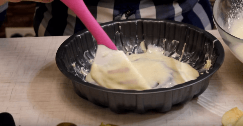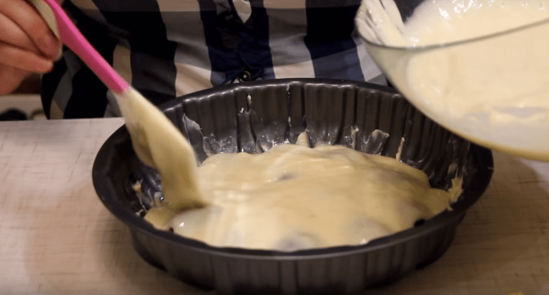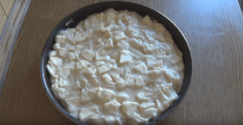 - Оставшееся тесто влейте в форму с яблоками, после чего поместите форму с заготовкой пирога в духовку, разогретую до 180 градусов.