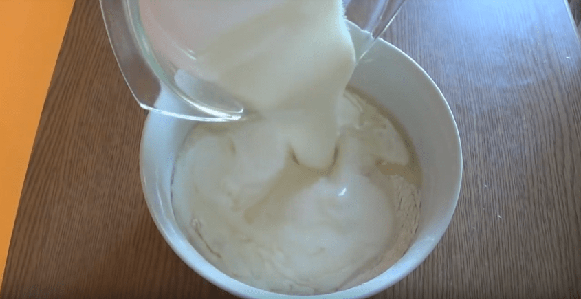 4. Вливаем стакан кефира, тщательно перемешиваем, растворяем сахарный песок.