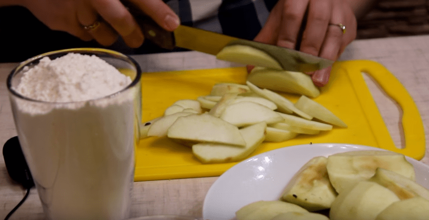 1. Яблоки очищаем от кожуры и семян и нарезаем их дольками. Пока они будут ждать своей очереди, они могут потемнеть. Для того, чтобы этого не случилось, сбрызните их лимонным соком.