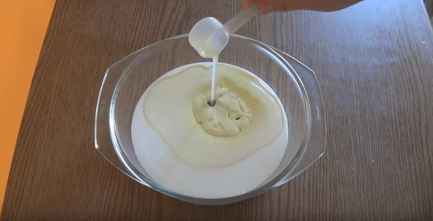 Сливочное масло нарежьте кубиками, поместите в эмалированную миску и слегка растопите. В другой емкости смешайте кефир комнатной температуры и пищевую соду. Хорошо перемешайте кефир, чтобы смесь стала однородной, и кислота погасилась полностью.