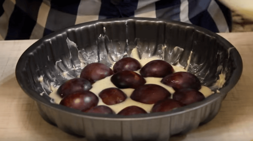 8. Следующим слоем опять идет тесто. Наливаем его столько, чтобы оно полностью закрыло сливы.