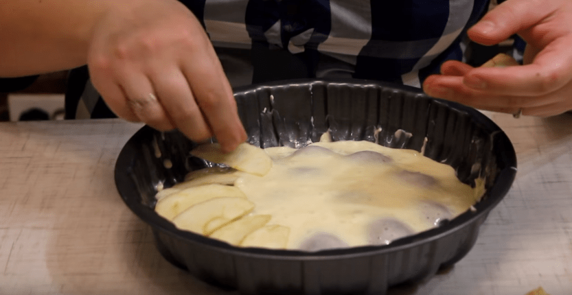- Духовой шкаф прогреть до 180С, формочку смазать небольшим количеством подсолнечного масла без специфического запаха, выложить четвертинки яблок и залить тестом.