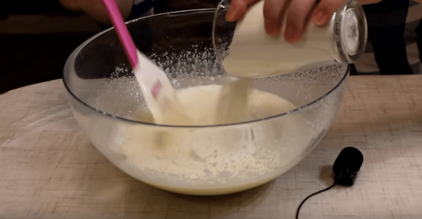 - Яйца разбейте в чашу миксера или удобную мисочку, а затем хорошенько взбейте их до образования пены, постепенно добавляя в яйца весь сахар. Кефир, погашенный содой, влейте в емкость с яичной смесью. Тщательно перемешайте, чтобы консистенция получилась полностью однородной.