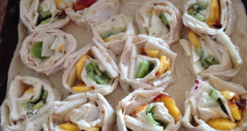 7. Аккуратно заверните пласт теста с фруктами в рулет и нарежьте кусочками по 4 см толщиной. Перенесите эти рулетики на противень с тестом, слегка их раскройте. Положите сверху полотенце и оставьте для расстойки.