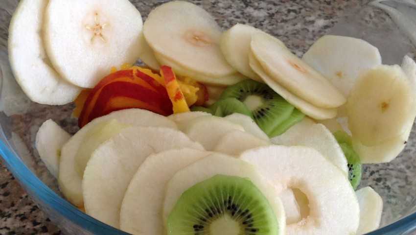 5. Все фрукты очистите от кожуры и семян, и нарежьте тонкими слайсами. Сбрызните соком лимона, чтобы яблоки и груши не потемнели.