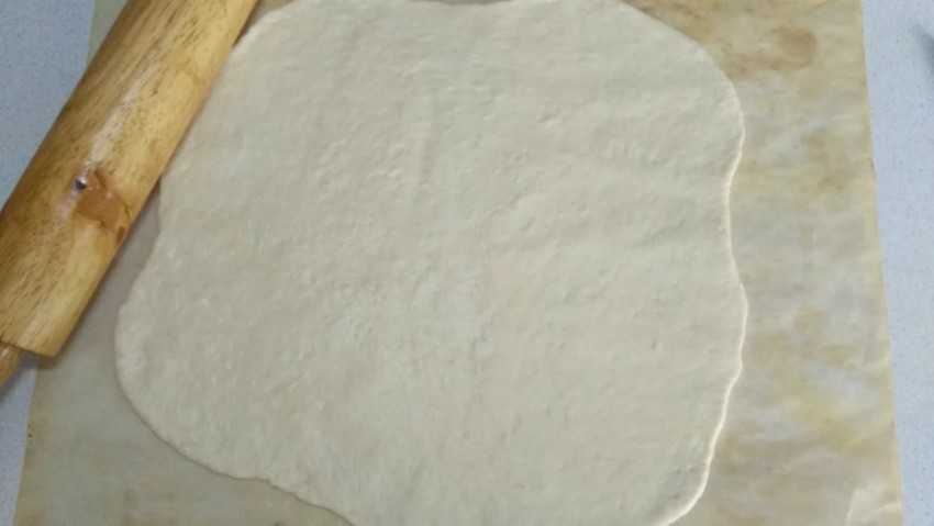 4. Противень смажьте маслом и переложите на него раскатанное тесто.