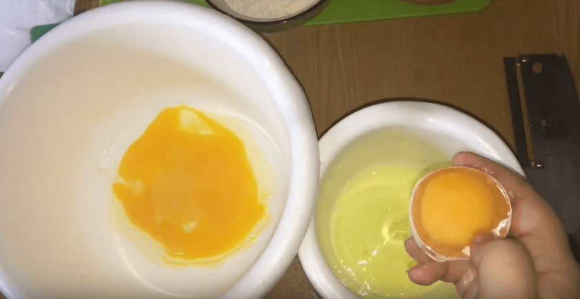 1. В первую очередь отделяем белки от желтков и кладем их в разные посудины.