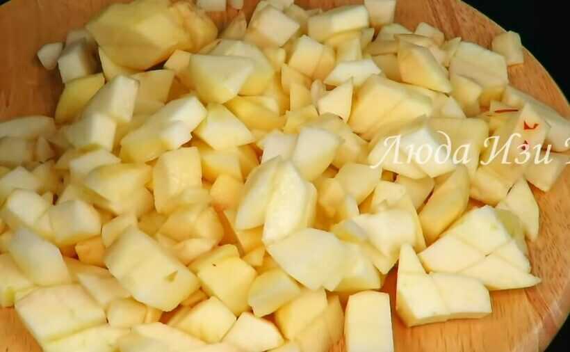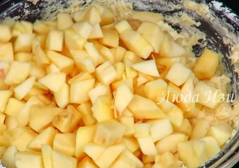 Очищаем яблоки от кожуры и режем кубиками. Добавляем яблоки в тесто. Еще раз все перемешиваем.