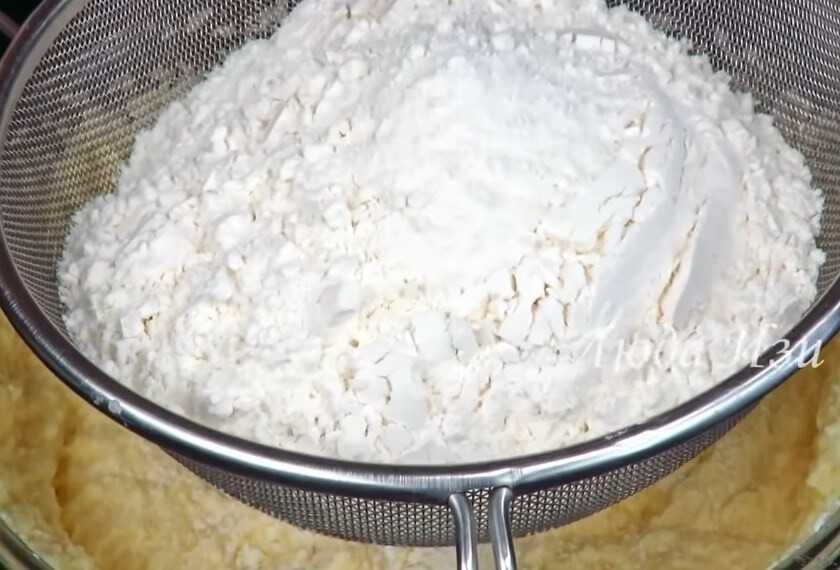 - К получившейся творожной массе добавляем муку, разрыхлитель и ванилин.