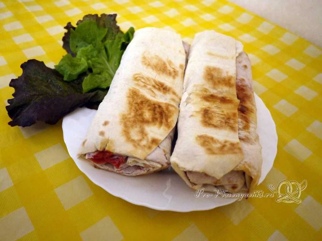 Далее шаурму нужно обжарить. Сделать это можно как на сухой сковороде, так и на слегка смазанной маслом. Я жарила на сухой сковороду-гриль, так на лаваше останутся симпатичные зажаренные полоску. Обжариваем с обеих сторон.