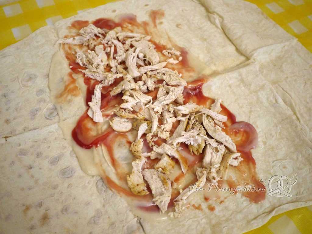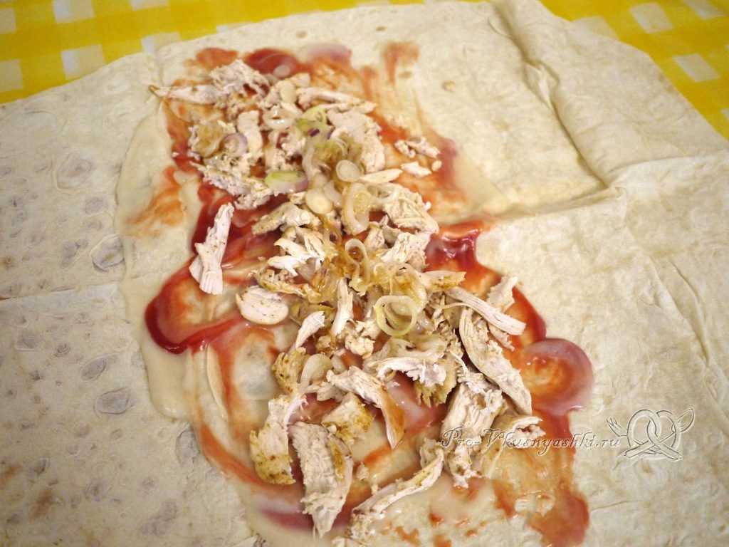 - Лаваш положить на разделочную доску, смазать приготовленным соусом. Выложить слой курицы, сверху-огурец. Следующим слоем выложить помидоры, полить небольшим количеством соуса. Далее — капуста. Завернуть начинку в лаваш.