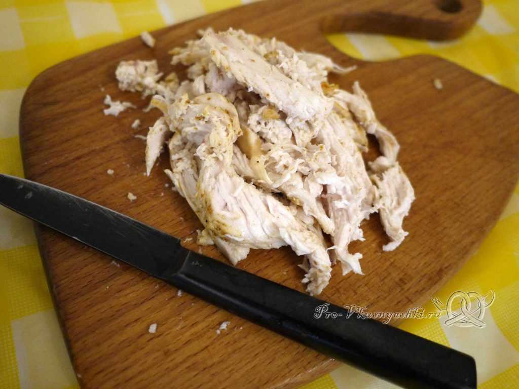 - Если у вас нет запеченной курятины, то приготовьте — это не сложно. Куриное филе обвалять в специях и оставить мариноваться на 10-15 минут. В качестве маринада можно использовать горчицу, соевый соус (по вкусу).
