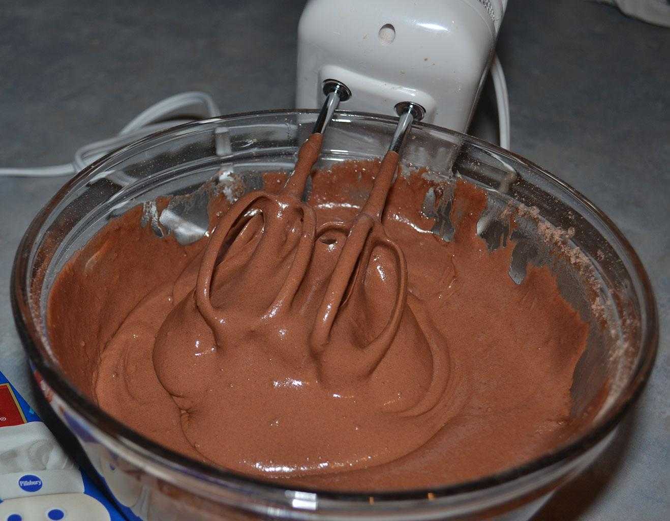 - Поделите тесто на две равные части. В одну добавьте 3-4 столовых ложки какао-порошка и взбейте тесто на малой скорости до равномерного окрашивания массы в шоколадный цвет без комочков какао-порошка.