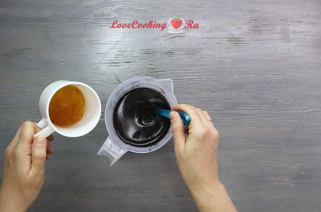 10. Шоколад растопить на водяной бане. Когда от станет уже мягким, добавить к нему желатин и все вместе довести до однородности.