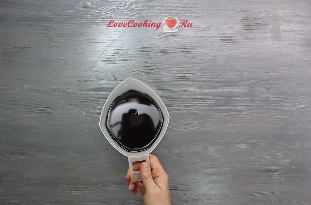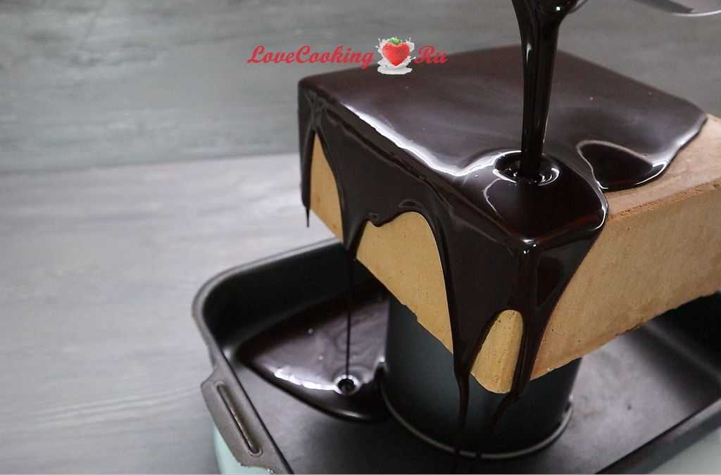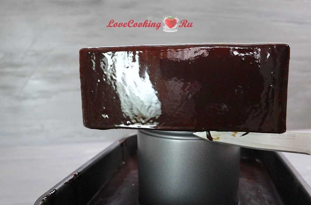 17. Залить торт глазурью и отправить в холодильник для полного застывания, на час-полтора. В идеале — на ночь, но и через полтора часа торт будет достаточно застывший.