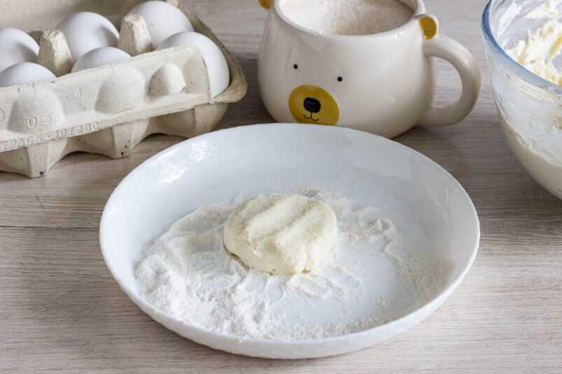 - Добавляем в массу просеянную муку. Тщательно вымешиваем до однородности.
