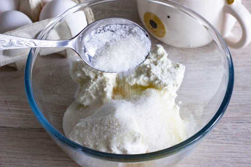 - Выкладываем в миску творог. Сюда же отправляем куриное яйцо, щепотку соли, ванильный и обычный сахар. Взбиваем удобным способом.