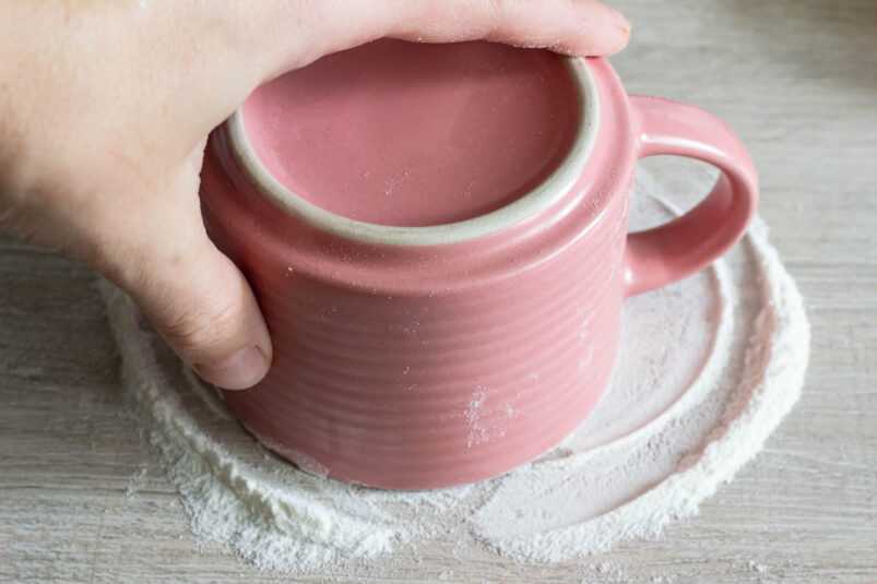 Возьмите кружку большего диаметра, чем сырник, накройте сырник и совершите несколько круговых движений по столу.