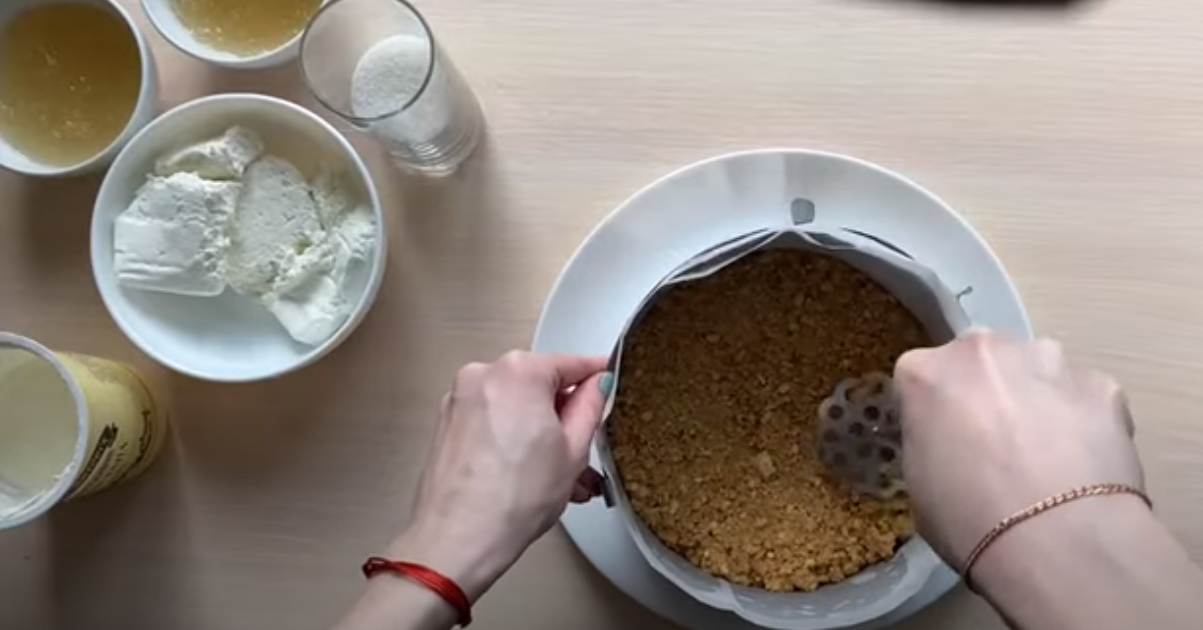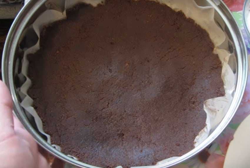 3. Круглую форму для выпечки выстелите пергаментной бумагой, выложите большую часть песочного теста и равномерно распределите по дну в виде коржа. Это основа для десерта.
