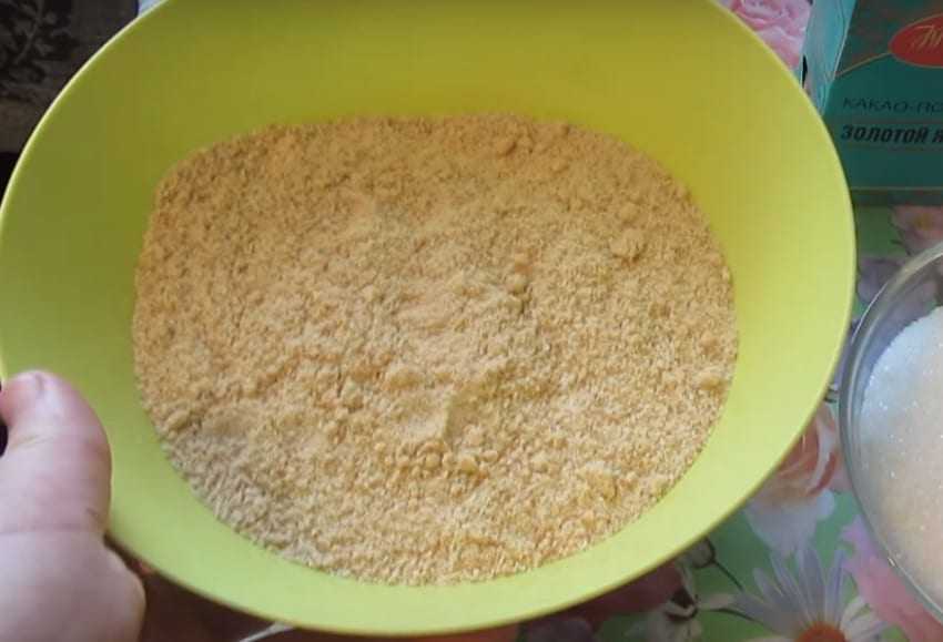 2. Крошку смешайте с какао-порошком и размягченным сливочным маслом, перемешайте до получения однородной консистенции.