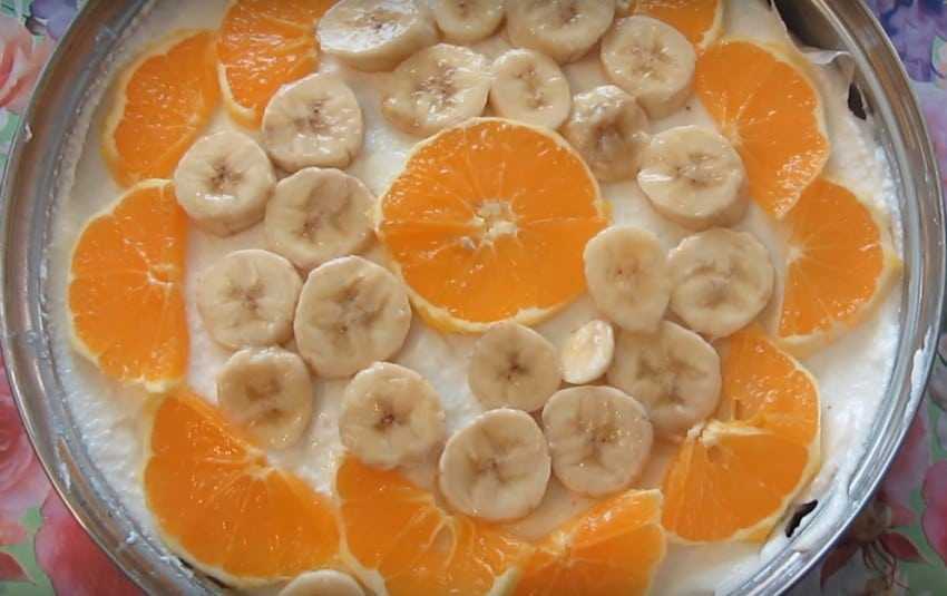 11. Через 20 минут достаньте угощение, сверху выложите нарезанные кружочками бананы и дольки очищенного от кожуры апельсина.